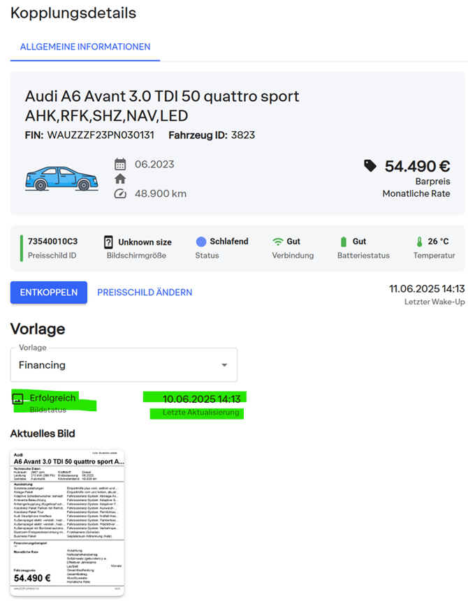 Wenn die Fahrezugdetailseite über die Suche aufgerufen wird, dann können Sie im unteren Bereich bei einem gepairten Fahrzeug die zuletzt durchgeführte Aktualsierungen sehen. Auch neue, bereitstehende Bilder werden angezeigt.